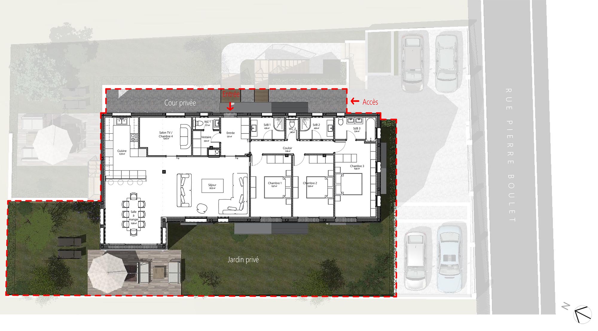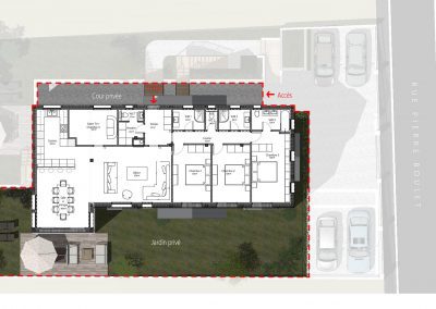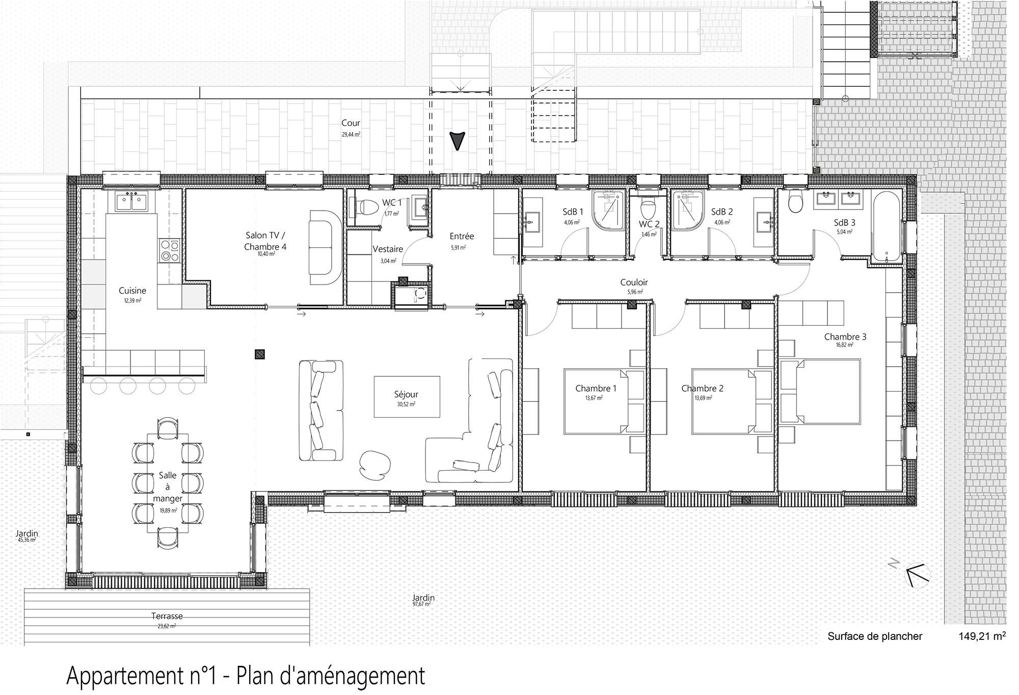 LOT 1 Situation : Rez-de-chaussée Niveau rue Surface 149 m2 Appartement de plain-pied avec jardin côté sud-ouest. 4 grandes chambres, 3 salles de bain. Une immense pièce à vivre de plus de 60 m2 ouverte sur le jardin.